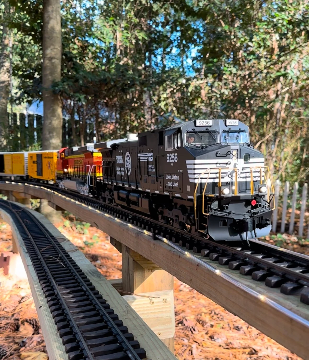 The BeeLine is a G Gauge outdoor layout custom designed to fit our landscape and flow with the elevation changes. Much of the layout is elevated to keep the grades reasonable. This improves operation and locomotive reliability. Our curves are broad, with our minimum diameter being around 18-19ft curves. It was designed to reduce the amount of maintenance needed, whilst keeping operations reliable.