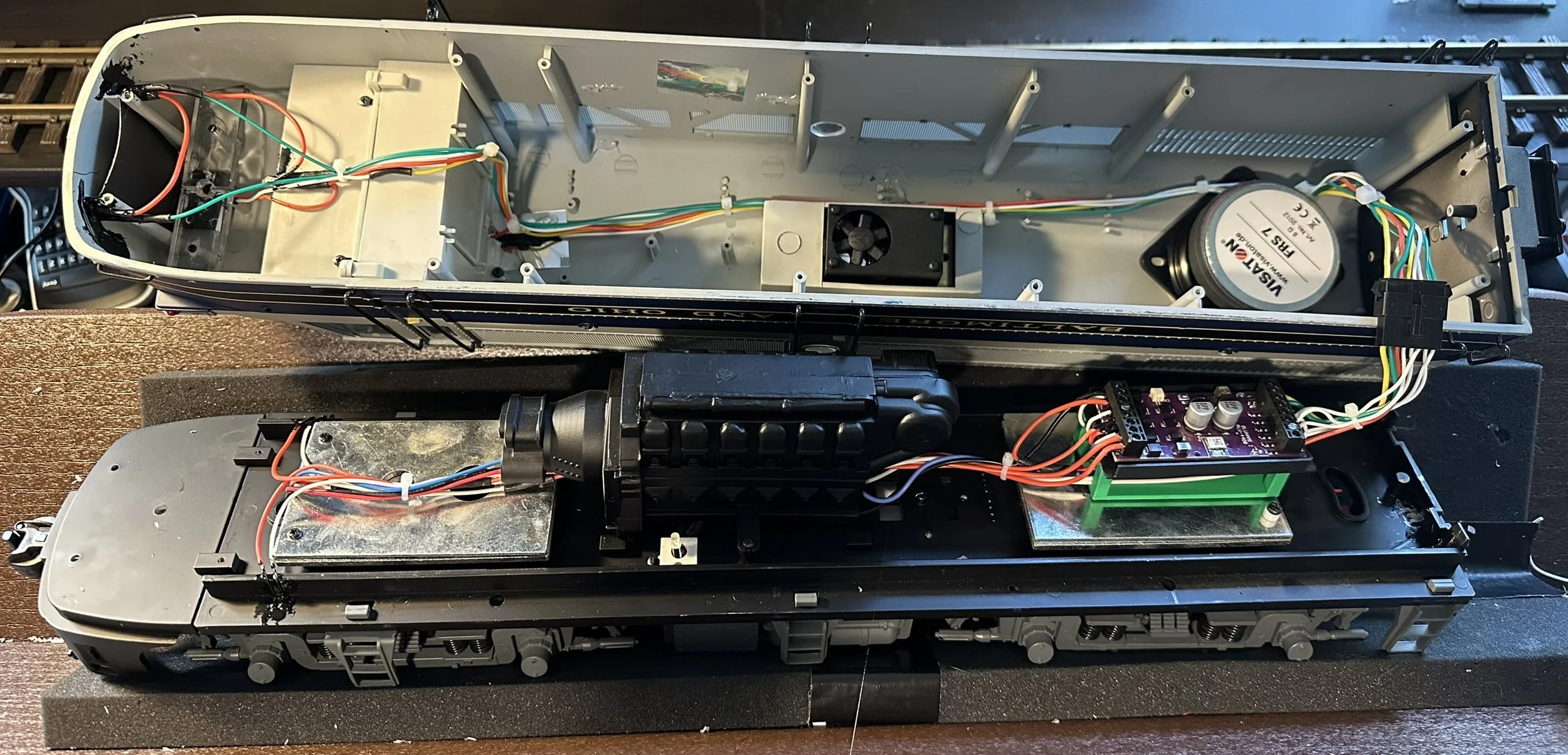 We can do anything from a basic install (to just control motors and add sound) to a fully custom installation (multiple speakers, switchable between battery and track power, multiple LED lighting additions, etc.).